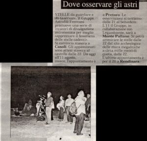 - presso il sito archeologico di Montepallano di Tornareccio (CH), l’11 Agosto, per meglio apprezzare il fenomeno delle stelle cadenti in collaborazione con l’associazione locale di Legambiente: le osservazioni si sono tenute dalle ore 22.00 dal sito archeologico delle mura megalitiche situate presso la sommità di Montepallano a circa 1000 metri di quota.