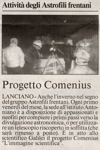 Proseguono gli incontri del Gruppo Astrofili Frentani in collaborazione con il Liceo Scientifico “Galileo Galilei” di Lanciano ha organizzato, nell’ambito del progetto europeo Comenius, una serie di attività con i ragazzi delle classi IV e V per meglio apprendere alcune tecniche di fotografia scientifica ed in particolare di fotografia astronomica.